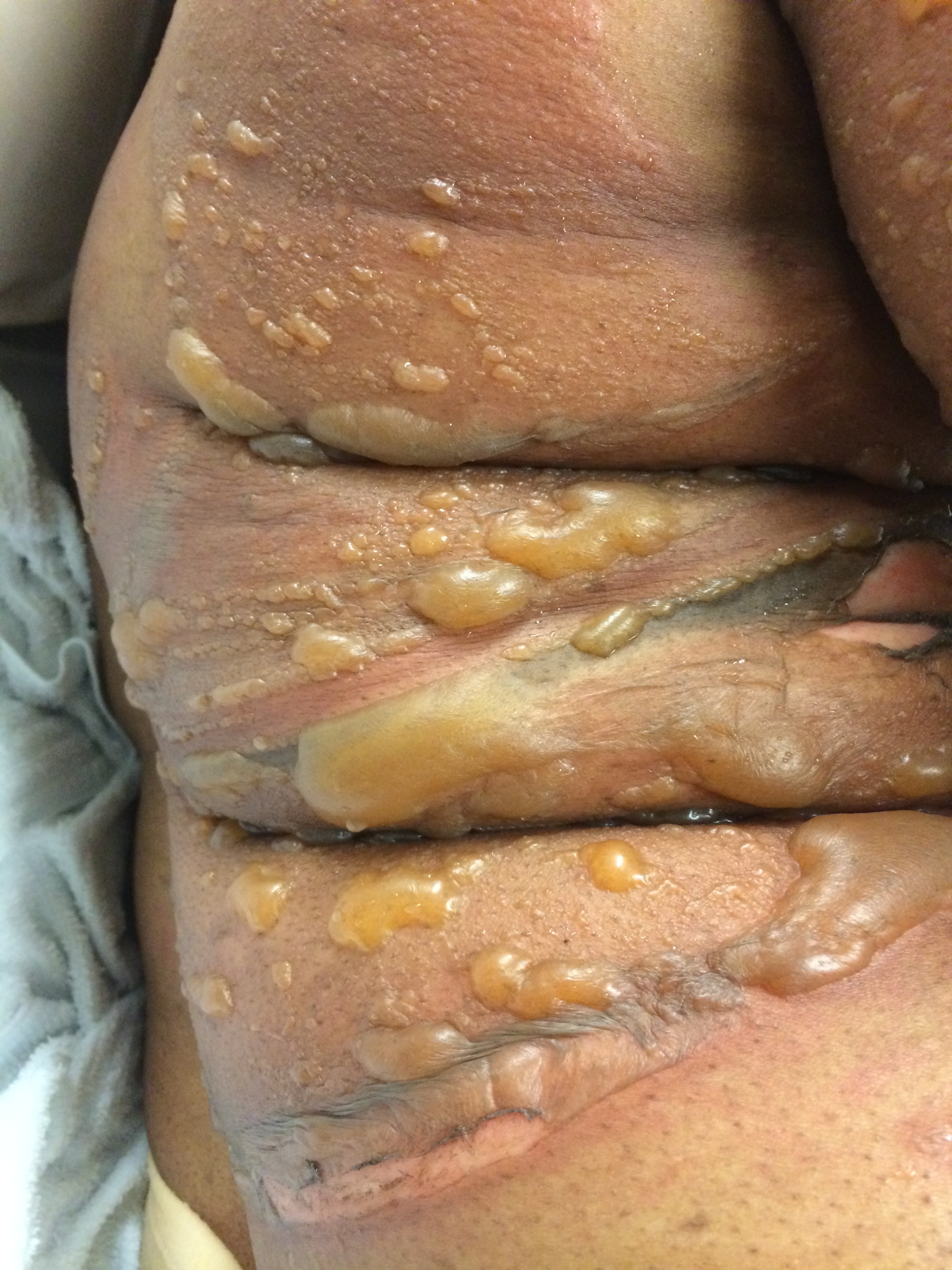How long would you spend debriding these blisters, if there is no proof it helps?In contrast: are you going to spend all shift debriding, or even aspirating, the bullae in a patient like the one pictured here, if there is no evidence it helps? Sounds like an exercise in futility to me. These are blisters I may be more likely to leave alone. I might consider aspirating the largest of these blisters in the center, but probably wouldn’t take it farther than that.