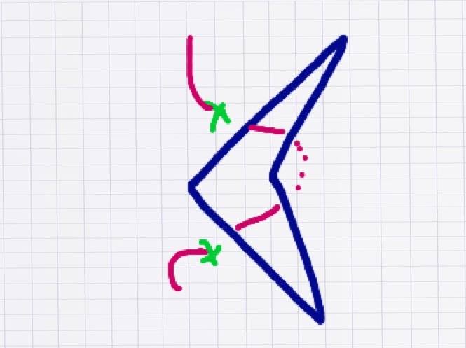 Measure points of equal distance from the apex on both sides of the wound edge.(3) Next, a corner stitch is applied. Enter with the suture needle on either side of the base where the green “X” is. Exit in the center of the wound bed, drive the suture in a half-buried fashion through the vertex of the flap edge (here shown in dotted purple), then exit at the site of the second green arrow.