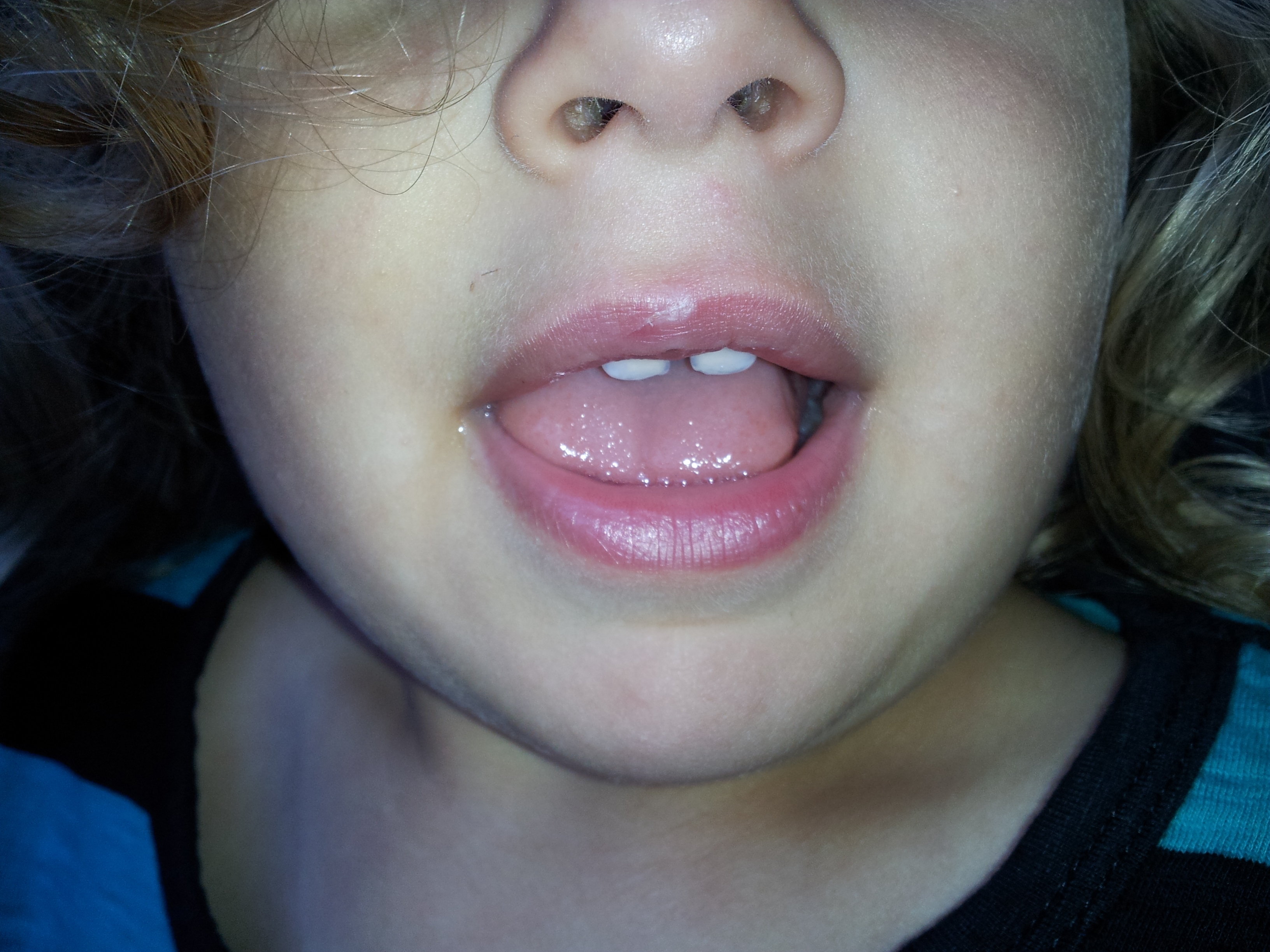 On closer inspection, the laceration does not cross the vermillion border, but does abut it. It is short but deep and bleeding a fair amount.This pretty young girl fell and hit her face, sustaining a nose contusion and a laceration of the upper lip. The laceration was freshly bleeding in this photo but deeper than the photo gives credence to. On careful inspection the laceration did not cross the vermillion border, but did abut it. After a discussion with her parents about the different options (primary closure was offered, but not recommended), we agreed on a plan of supportive management.