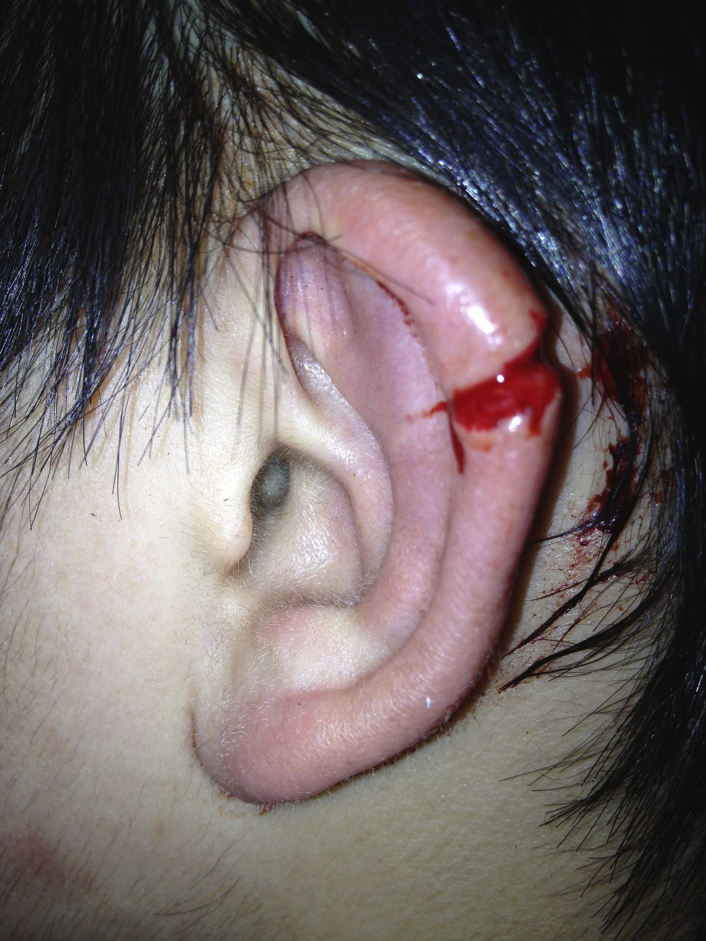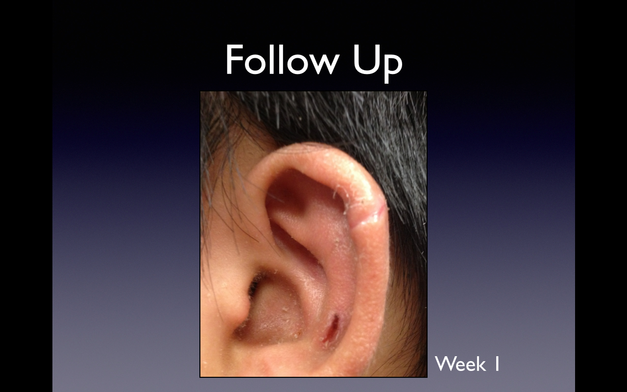 This teenager was horsing around with buddies. He landed on the side of his face and sliced his ear as shown. The laceration is small, but located in such a way that I knew careful repair would be needed for the best outcome.