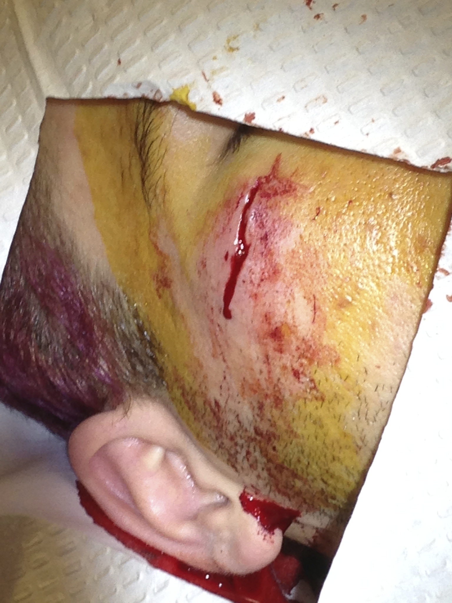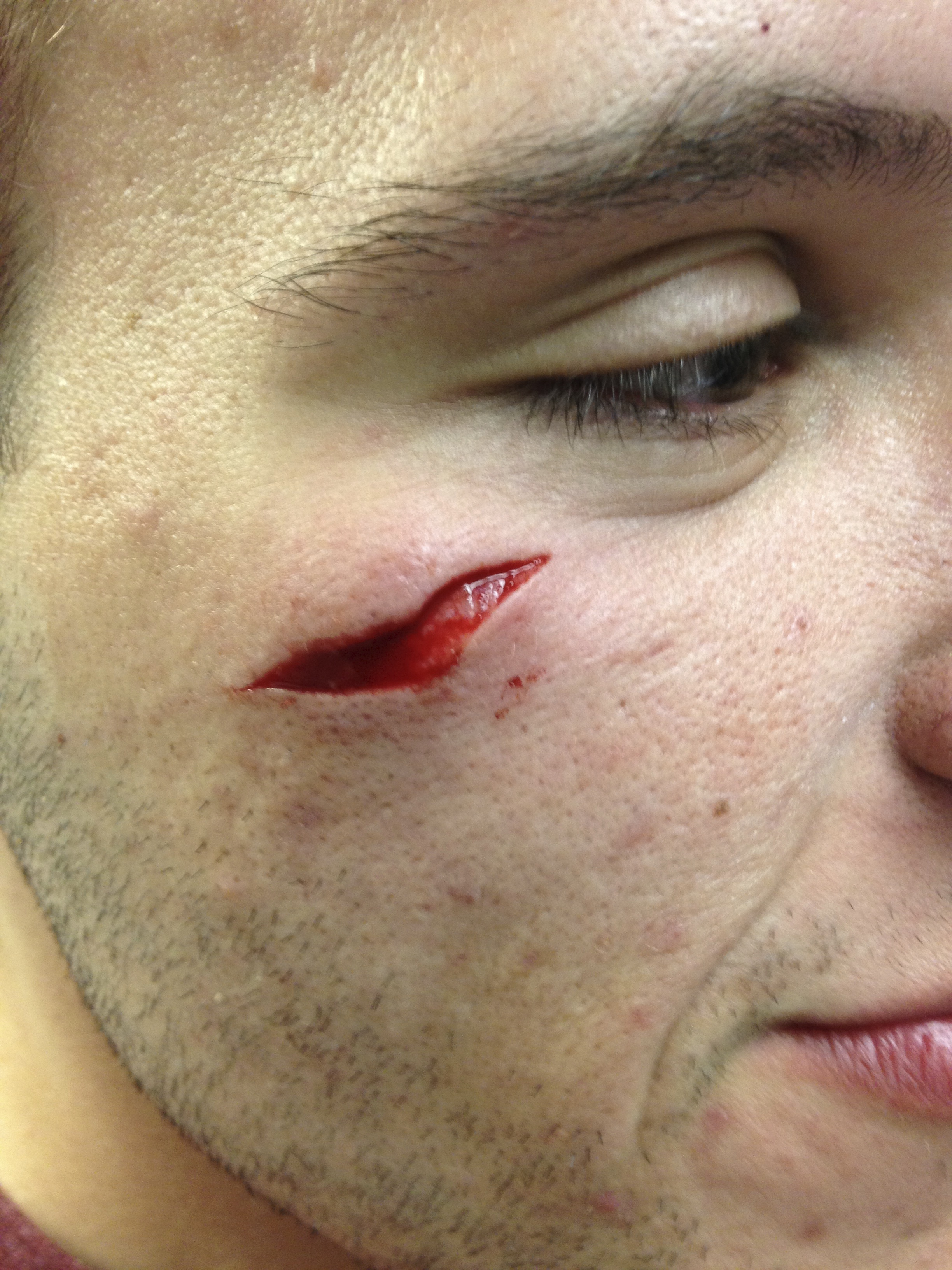 Young man with a facial laceration. This and all subsequent images used with patient permission.Take this case for example. I met this young man as a patient in the ER earlier this year. He got out of bed during the night, tripped in the dark, and hit his face on the bed post. He sustained a pretty substantial laceration. Being that it was on his face, I wanted it to look nice. And given the tension on the wound edges and irregular margins, I felt he’d do a lot better getting a closure with simple interrupted sutures to give the wound better support. But he made it very clear to me from the outset–he was uninsured, and not planning to come back for any additional visits, as he just couldn’t afford it.