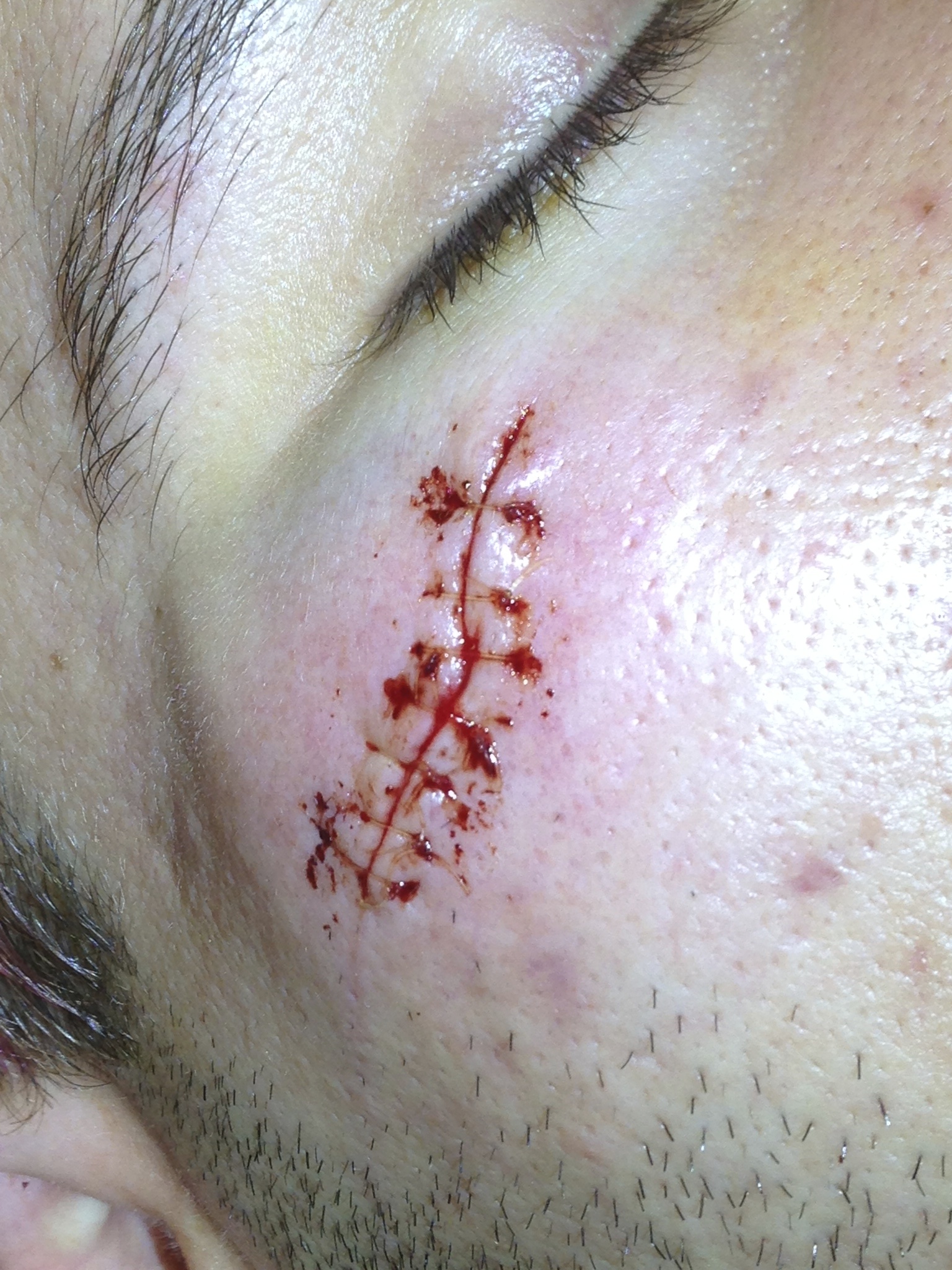 The appearance of the wound after closure with simple interrupted fast absorbing plain gut sutures.The one comment I would make is that sewing on the face with FAPG is like sewing fine threads of tissue paper through skin. Pulling on these sutures too hard is likely to make them break apart. So you will want to reserve this technique for relatively low tension wounds, or use a layered closure or undermining to reduce superficial tension.