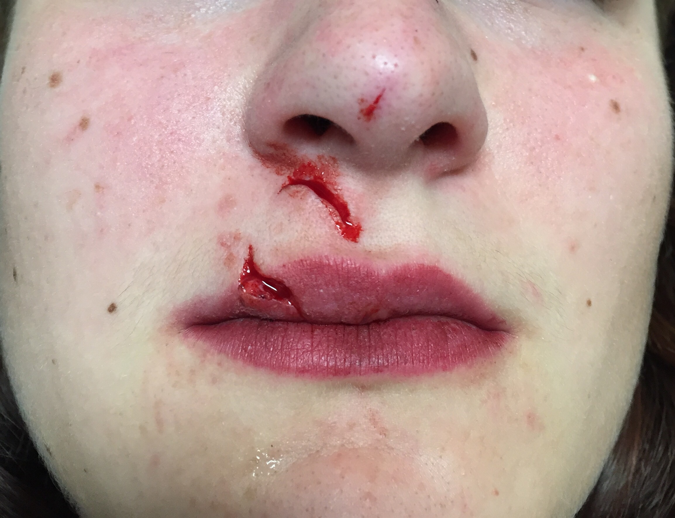 Lacerations caused by a dog bite. The upper and lower jaws of the dog are perfectly outlined in this full thickness laceration; the lower laceration is stellate and crosses the vermillion border of the upper lip.