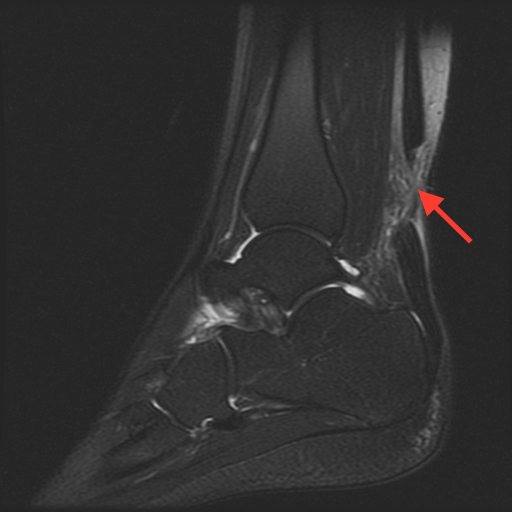 Complete calcaneous (Achilles) tendon laceration, with 2.5 cm separation as noted by red arrow.As an outpatient, the patient went on to have an MRI which confirmed the Achilles tendon was completely severed. The patient went on to have an operative repair of the tendon one week later, with a good prognosis for a normal functional outcome.