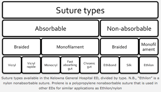 A breakdown of suture types commonly used in the ED. Table initially published at the website BoringEM.The take home point from this table is that sutures really break down in to two flavors: absorbable and non-absorbable. Non-absorbable sutures have traditionally been the suture of choice for most urgent care applications. However, there is an expanding role for the use of absorbable sutures in superficial wound closure.