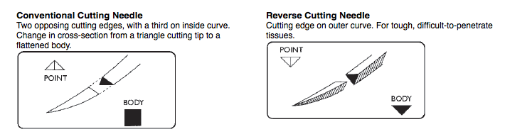 The two major needle types most commonly used in repair of traumatic lacerations. From the Ethicon online catalog.Reverse cutting needles are similar, except that the cutting edge surface is on the outside of the C-shaped curve of the needle. The idea is to decrease the risk of the suture pulling through the tissue due to the groove in the skin layers that you would naturally form with a cutting needle.