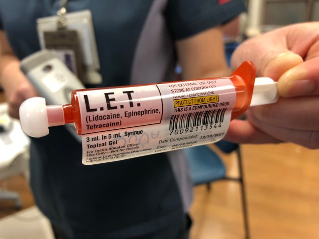 LET was created as a safer alternative to Tetracaine-Adrenaline-Cocaine. 4% lidocaine simply subs in for the cocaine to create it. It isn’t sold commercially, and will need to be prepared by your pharmacist or nurse prior to use. It can be prepared as a gel (more viscous) or a solution (less viscous). It’s designed for use on non-mucosal skin surfaces including lacerations. You can use a cotton tipped applicator to apply 1-3 ml to the wound with firm pressure for 15-30 minutes. LET is perfect for lacerations as it is absorbed within the wound bed–it actually won’t work on intact skin.